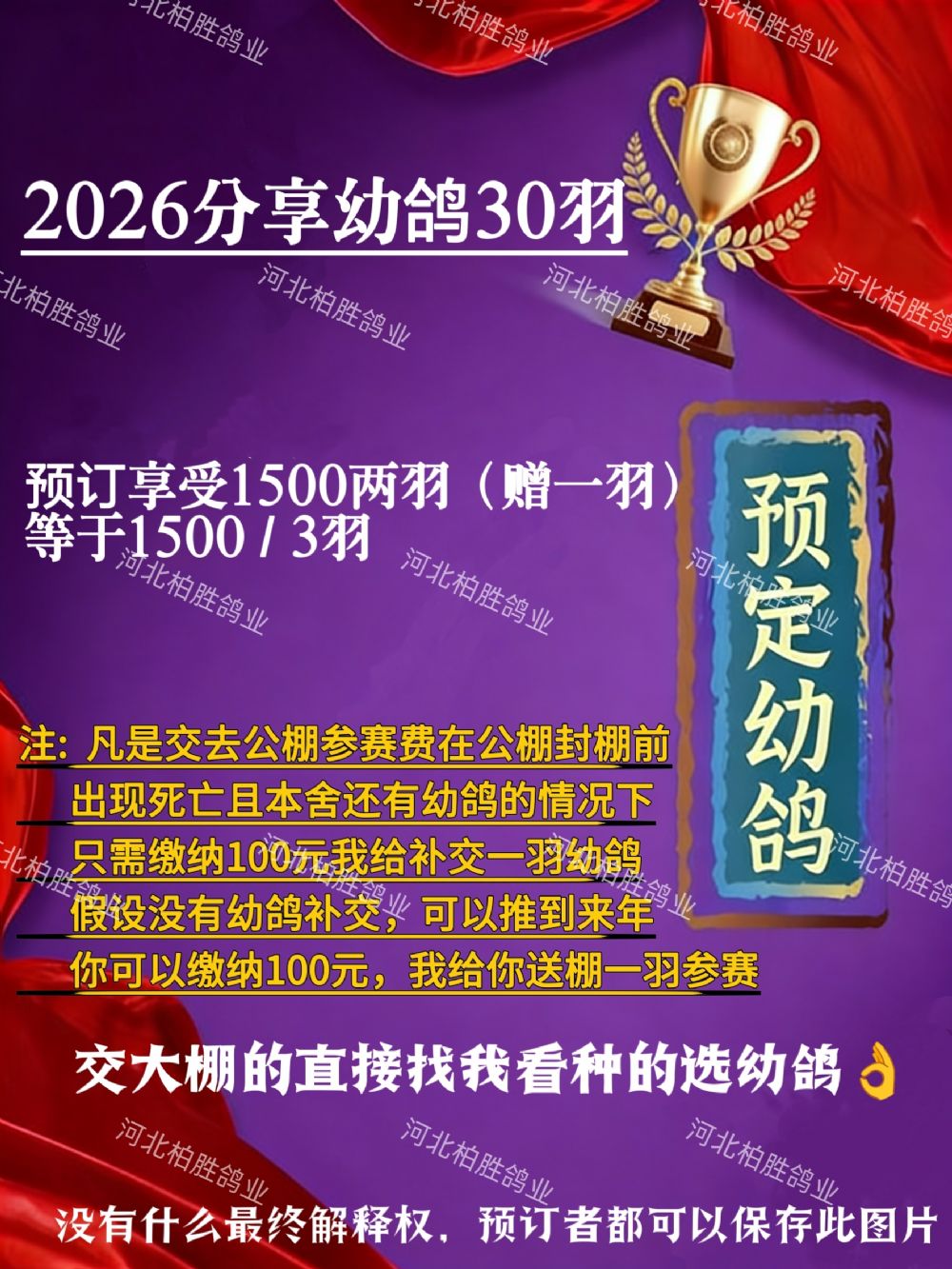2026分享幼鸽30羽 预订享受1500两羽(赠一羽) 等于1500/3羽 注:凡是交去公棚参赛费在公棚封棚前 出现死亡且本舍还有幼鸽的情况下 只需缴纳100元我给补交一羽幼鸽 假设没有幼鸽补交可以推到来年 你可以缴纳100元,我给你送棚一羽参赛 交大棚的直接找我看种的选幼鸽 有想法的哈,联络;复制:tdr5858158(微信)